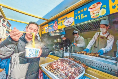这个冬季,前门大街比往年热闹得多。曾经冷清的后街小广场变成一片“城市露营地”,来自全国各地的美食摊位热气腾腾,现场不定期举办的音乐演出,吸引市民游客驻足。