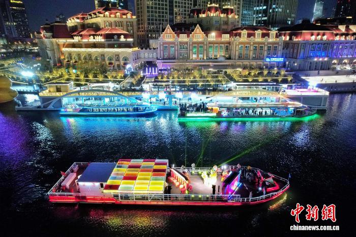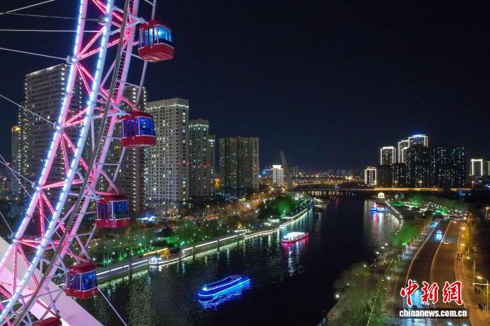 资料图为游客乘坐海河游船观看天津夜景。(无人机照片) 记者 佟郁 摄