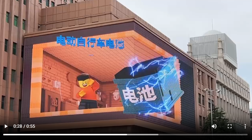 3D大屏消防公益宣传视频。 据东城区消防救援支队防火监督员王磊介绍,动画视频从创意提出到制作完成,总共历时四五个月。视频一共55秒,主角采用积木小人的形象,表现电动自行车违规充电、消防通道堵塞等常见消防隐患,以及灭火器使用方法等自救技能,通过巨型裸眼3D屏幕的特效,为市民游客营造出强烈的视觉冲击力。