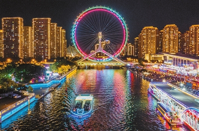 “‘天津之眼’摩天轮横跨海河永乐桥之上,是世界唯一实现‘桥轮合一’的建筑景观。今年,‘天津之眼’摩天轮实施了景区灯光提升改造工程,希望通过绚丽多彩的灯光效果,打造海河上一道更加亮丽的风景。”天津永乐文化旅游发展有限公司总经理吕振然介绍,通过景区内外焕新,带给游客更好的游览体验。