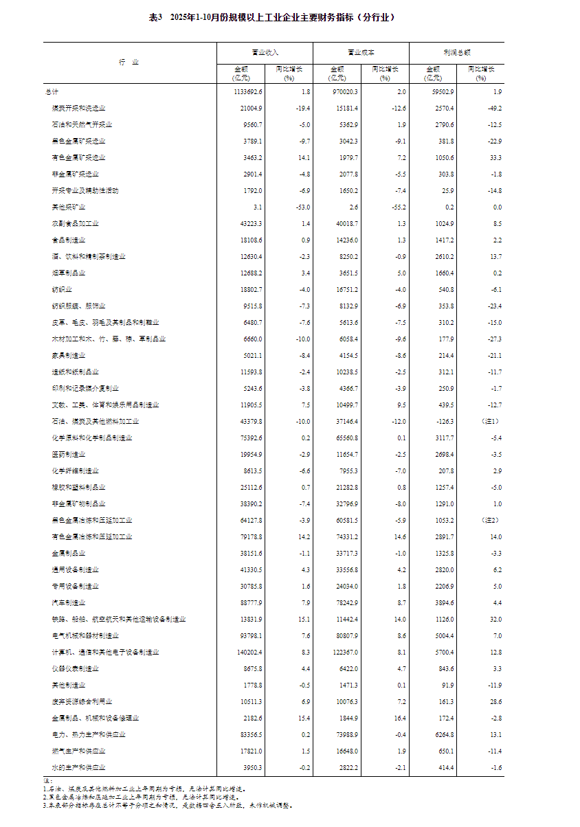 二、规模以上工业企业利润总额、营业收入等指标的增速均按可比口径计算。报告期数据与上年所公布的同指标数据之间有不可比因素,不能直接相比计算增速。其主要原因是:(一)根据统计制度,每年定期对规模以上工业企业调查范围进行调整。每年有部分企业达到规模标准纳入调查范围,也有部分企业因规模变小而退出调查范围,还有新建投产企业、破产、注(吊)销企业等变化。(二)加强统计执法,对统计执法检查中发现的不符合规模以上工业统计要求的企业进行了清理,对相关基数依规进行了修正。(三)加强数据质量管理,剔除跨地区、跨行业重复统计数据。