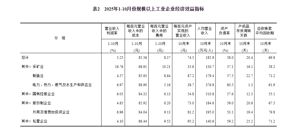 10月末,规模以上工业企业每百元资产实现的营业收入为74.5元,同比减少2.2元;人均营业收入为185.9万元,同比增加5.8万元;产成品存货周转天数为20.4天,同比增加0.4天;应收账款平均回收期为69.8天,同比增加3.4天。