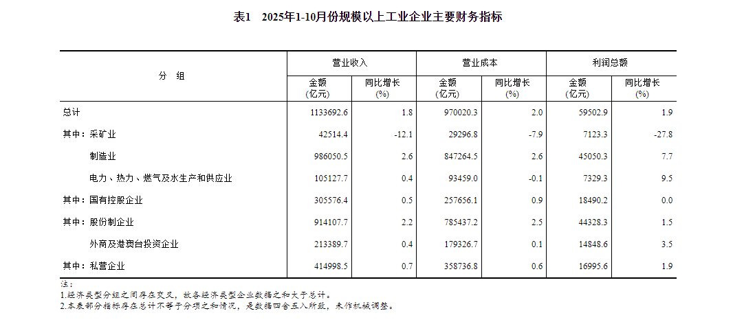 1—10月份,全国规模以上工业企业实现利润总额59502.9亿元,同比增长1.9%(按可比口径计算,详见附注二)。