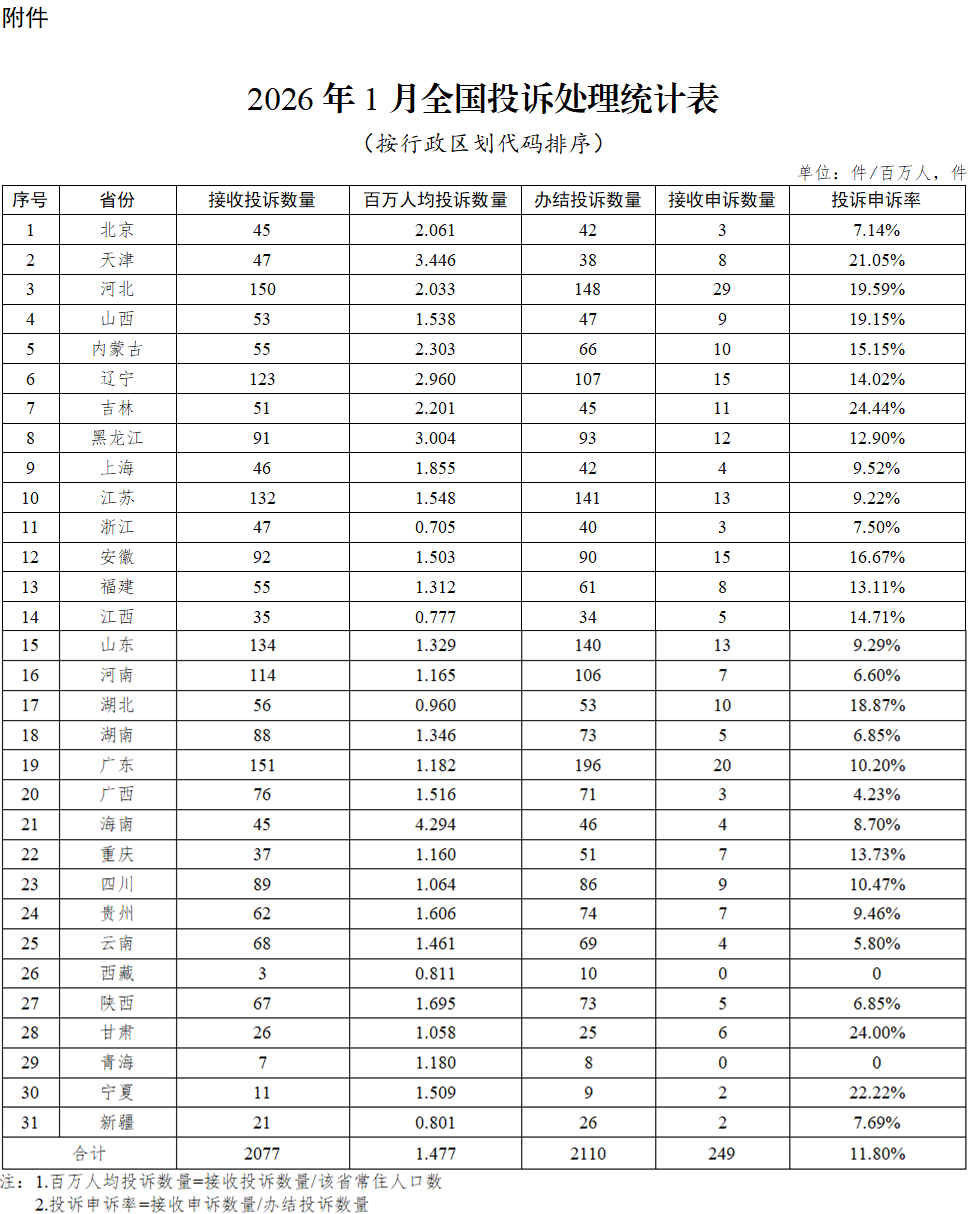 附件:2026年1月全国投诉处理统计表