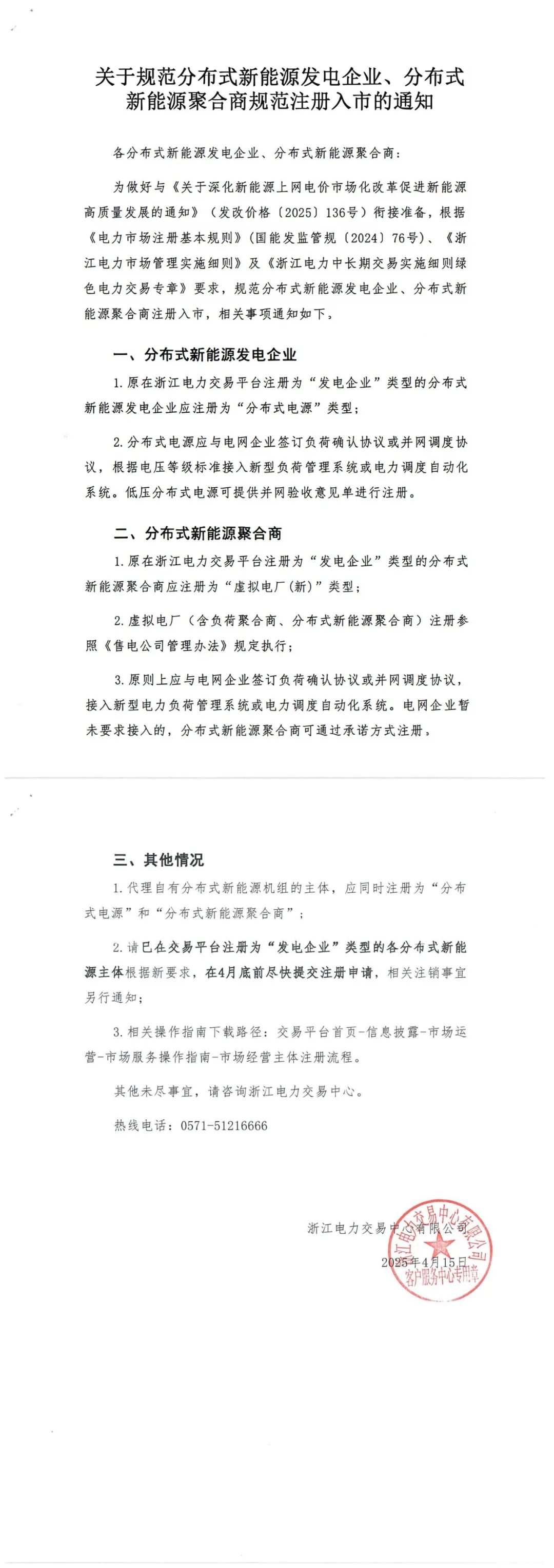 4月15日,浙江电力交易中心发布关于规范分布式新能源发电企业、分布式新能源聚合商规范注册入市的通知。文件明确,原在浙江电力交易平台注册为“发电企业”类型的分布式新能源发电企业应注册为“分布式电源”类型;分布式电源应与电网企业签订负荷确认协议或并网调度协议,根据电压等级标准接入新型负荷管理系统或电力调度自动化系统。低压分布式电源可提供并网验收意见单进行注册。