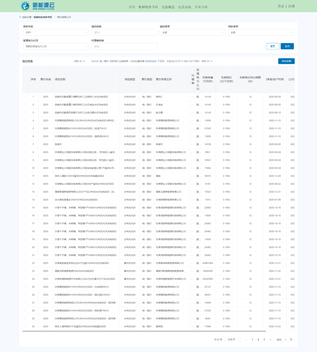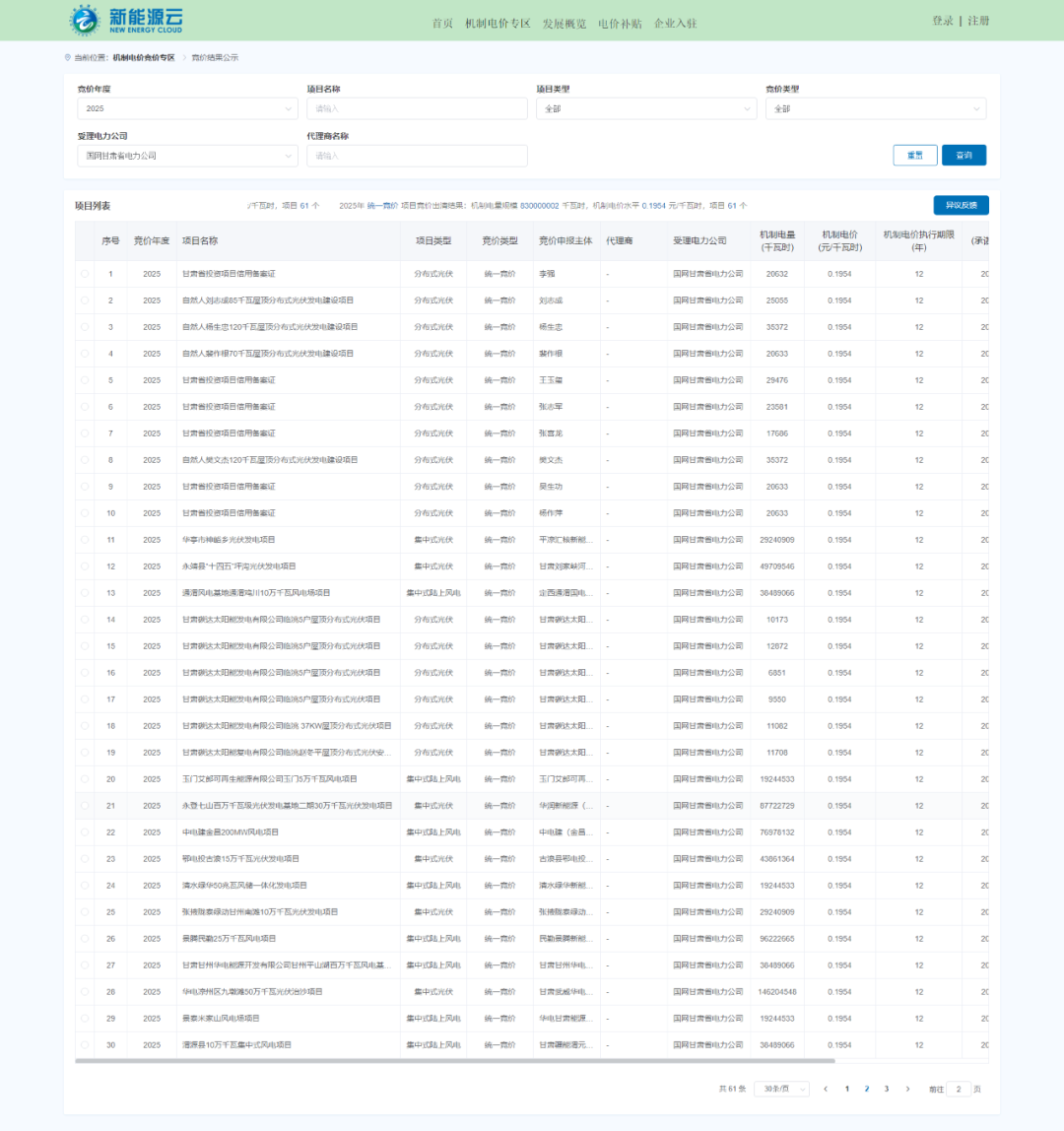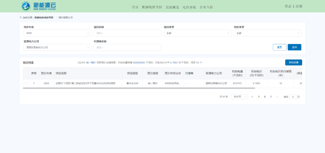 10月16日,国网新能源云平台公示甘肃省机制电价结果,其中,机制电量规模8.3亿千瓦时,风电、光伏项目机制电价均为0.1954元/千瓦时,共61个项目中标。