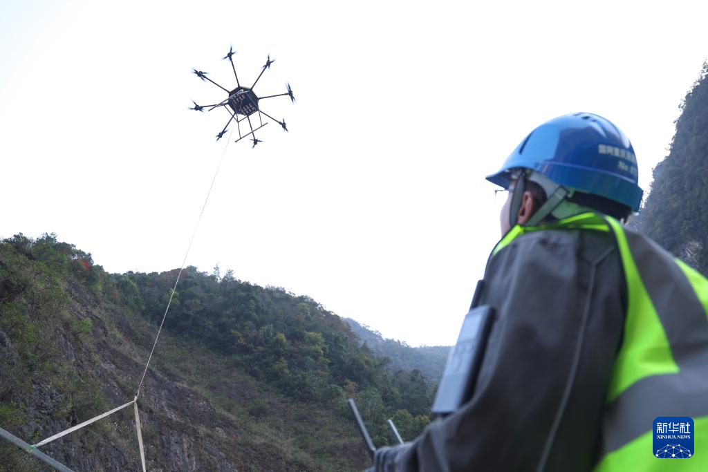 11月27日,在重庆市巫溪县中梁乡35千伏西土线改造现场,现场工作人员操作重载无人机吊运新建铁塔塔材。新华社记者 黄伟 摄