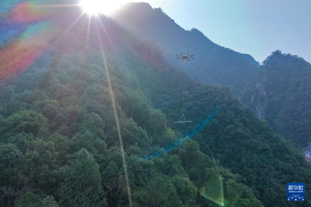 11月27日,在重庆市巫溪县中梁乡35千伏西土线改造现场,重载无人机在吊运新建铁塔塔材(无人机照片)。新华社记者 黄伟 摄
