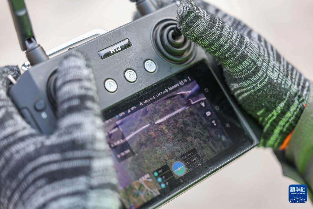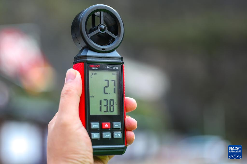 11月27日,在重庆市巫溪县中梁乡35千伏西土线改造现场,现场工作人员利用风速测量仪监测无人机起降的作业条件。新华社记者 黄伟 摄