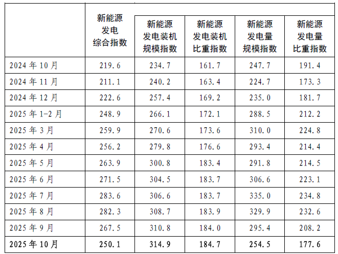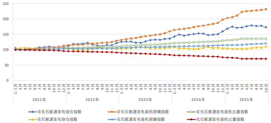 2025年10月,全国非化石能源发电综合指数为173.0,比2020年基期(以2020年基期为100)增长了73.0%,同比增长16.1%;其中,新能源发电综合指数为250.1,比2020年基期增长了150.1%,同比增长13.9%。在“双碳”目标引领下,非化石能源及其新能源发电综合指数保持快速增长态势。其中: