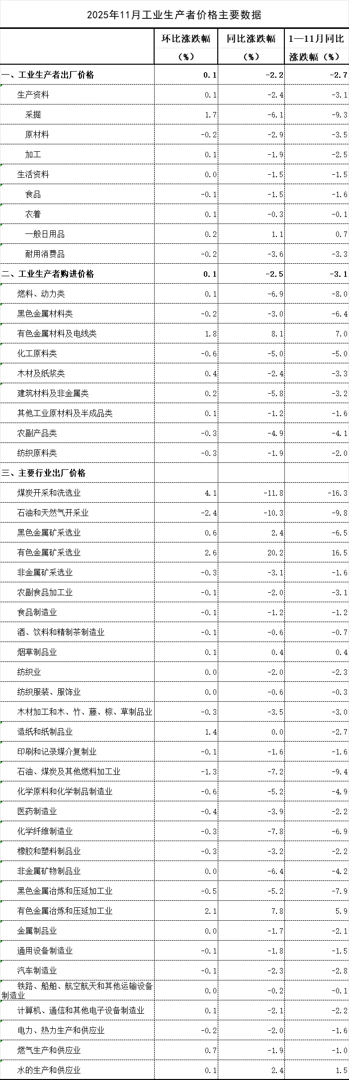 2025年11月份,全国工业生产者出厂价格同比下降2.2%,工业生产者购进价格同比下降2.5%;工业生产者出厂价格和购进价格环比均上涨0.1%,涨幅均与上月相同。1—11月平均,工业生产者出厂价格比上年同期下降2.7%,工业生产者购进价格下降3.1%。