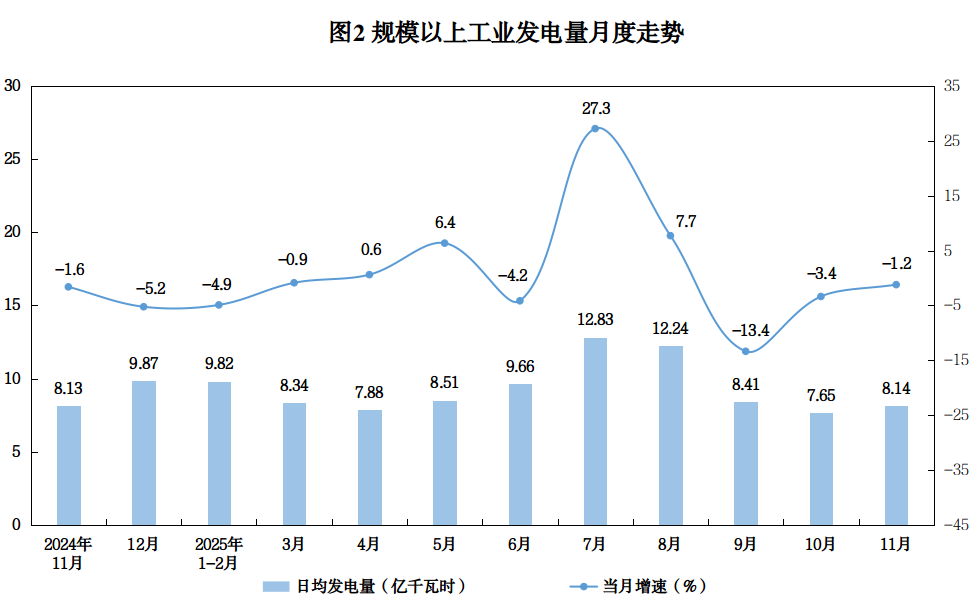 电力生产小幅下降,与上月相比降幅收窄。11月份,规模以上工业发电量244.30亿千瓦时,同比下降1.2%,降幅比10月份收窄2.2个百分点,日均发电8.14亿千瓦时。