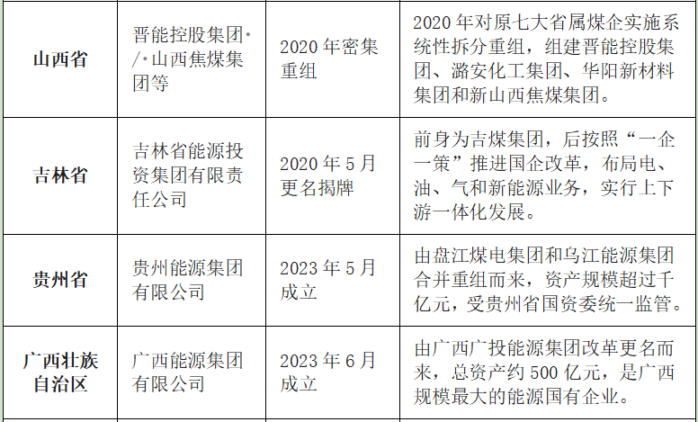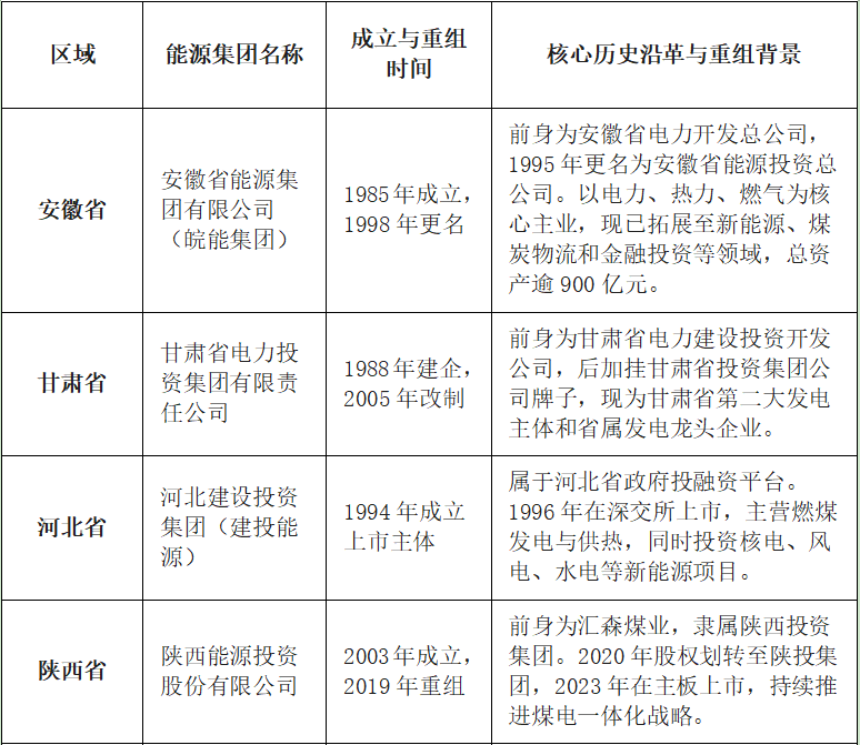 下表对中国主要省份省级能源集团的成立时间、历史沿革与重组背景做一梳理。