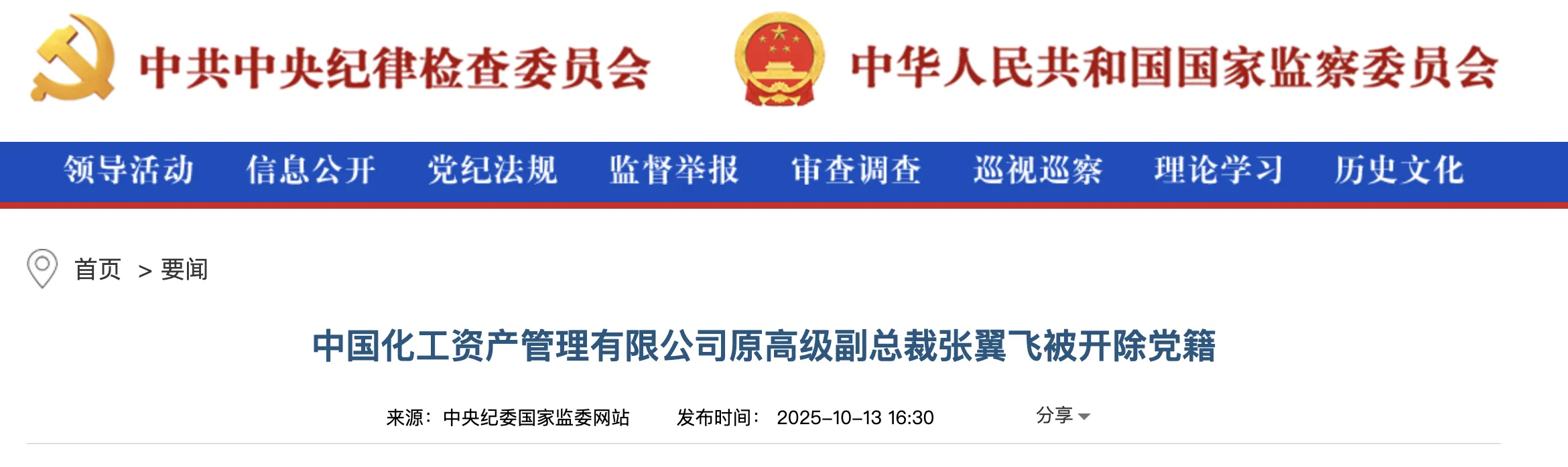 中央纪委国家监委网站讯 据中央纪委国家监委驻中国中化控股有限责任公司纪检监察组消息:日前,经中央纪委国家监委批准,中央纪委国家监委驻中国中化控股有限责任公司纪检监察组对中国化工资产管理有限公司原高级副总裁张翼飞严重违纪违法问题进行了立案审查调查。