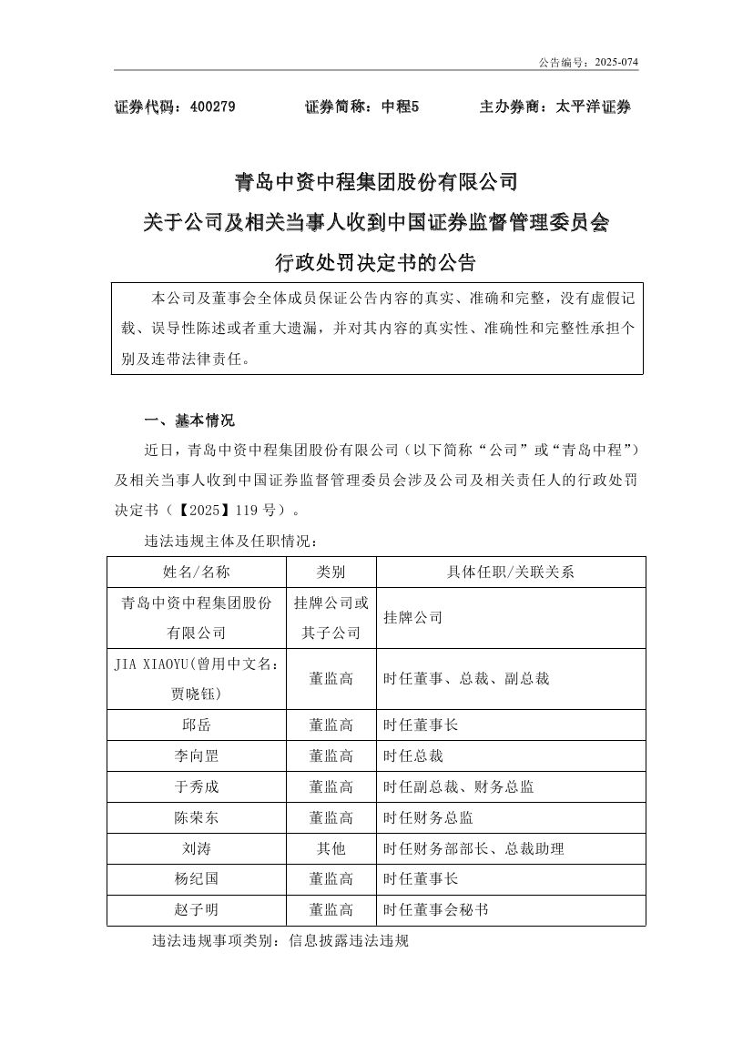 10月31日,青岛中资中程集团股份有限公司(简称“青岛中程”)发布关于公司及相关当事人收到中国证券监督管理委员会行政处罚决定书的公告。