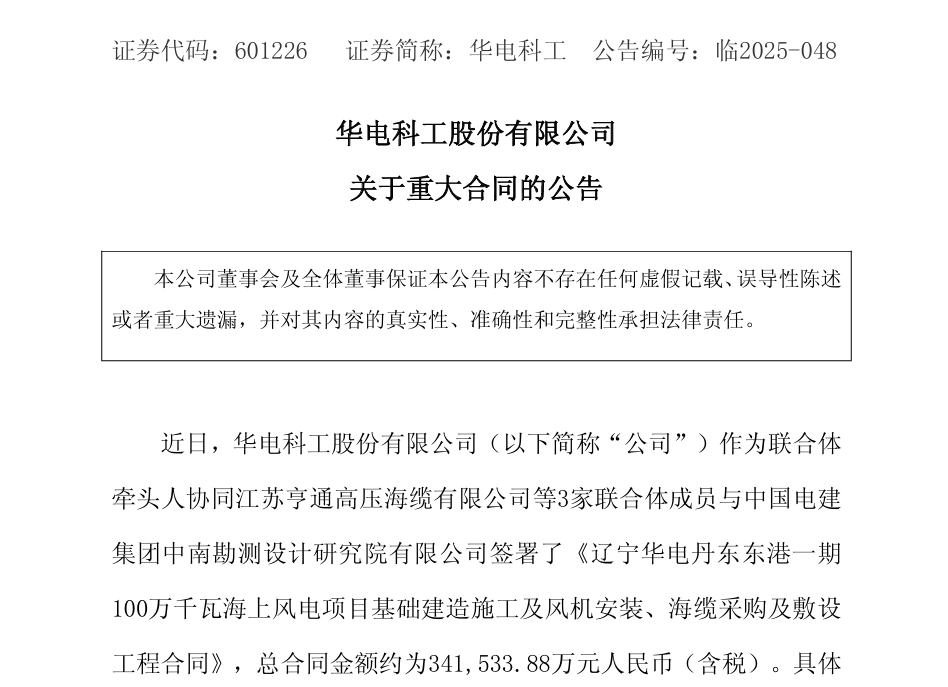 公告披露,近日,华电科工作为联合体牵头人协同江苏亨通高压海缆有限公司等3家联合体成员与中国电建集团中南勘测设计研究院有限公司签署了《辽宁华电丹东东港一期100万千瓦海上风电项目基础建造施工及风机安装、海缆采购及敷设工程合同》,总合同金额约为341533.88万元人民币(含税)。