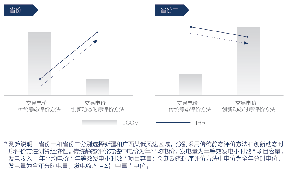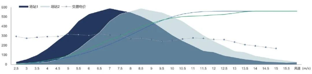 *测算说明:面积图代表不同场站1、2;两个场站年平均风速不同,选用不同出力特征的风电机组,两个场站全年总发电量相等;深色场站1,风速-电价匹配好,最终电量价格高、收益高;而浅色场站2则因电量价格低导致收益差。