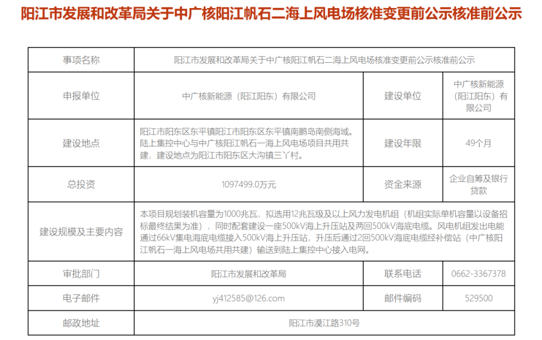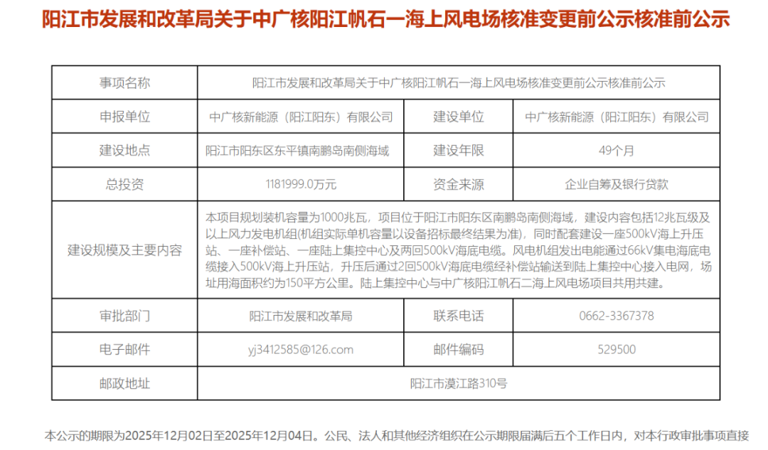 12月2日,阳江市发展和改革局发布关于中广核阳江三山岛五海上风电场项目、中广核阳江帆石一海上风电场、中广核阳江帆石二海上风电场核准变更前公示核准前公示。