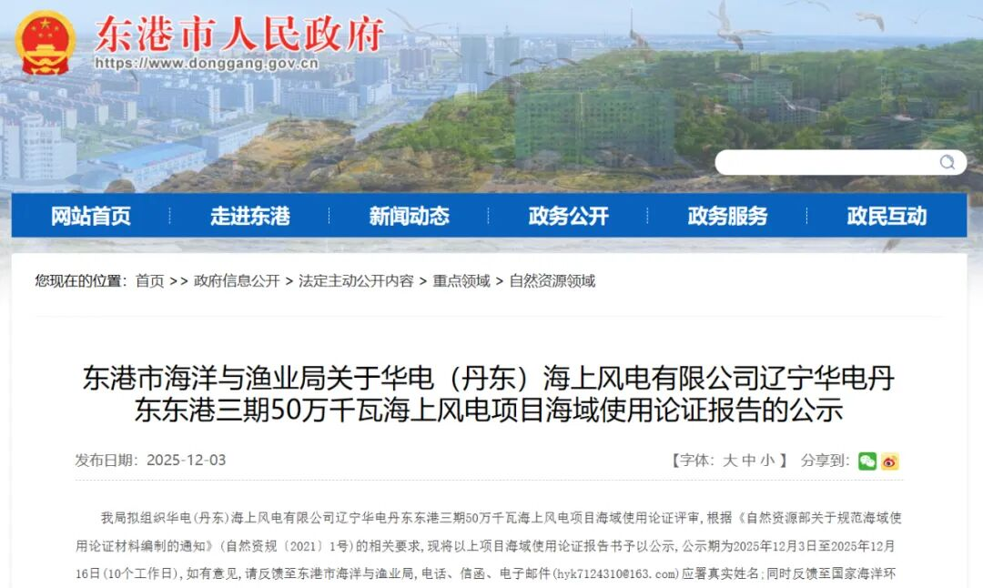 近日,辽宁省丹东市东港市海洋与渔业局发布《关于华电(丹东)海上风电有限公司辽宁华电丹东东港三期50万千瓦海上风电项目海域使用论证报告的公示》。