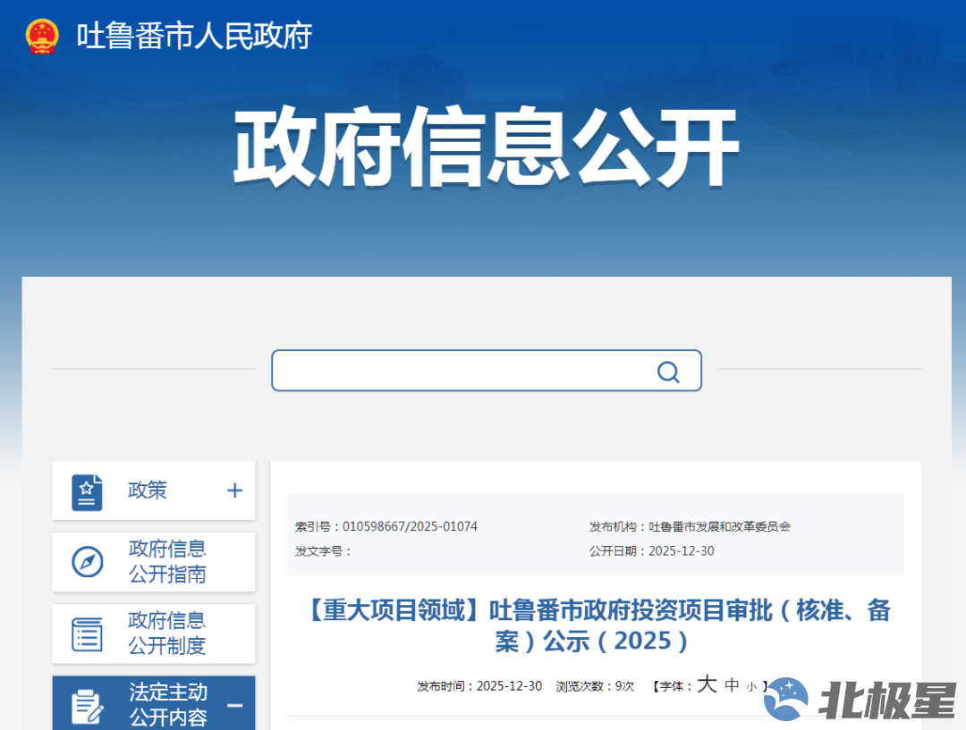 12月20日,新疆吐鲁番市人民政府发布《吐鲁番市政府投资项目审批(核准、备案)公示(2025)》。