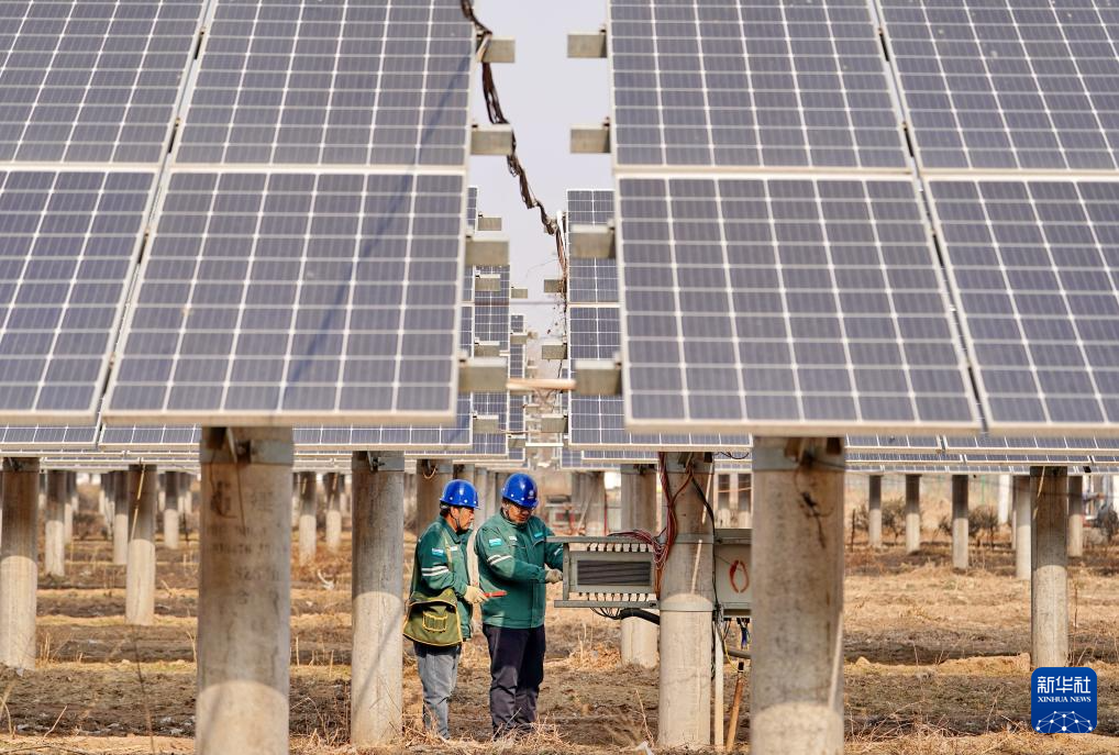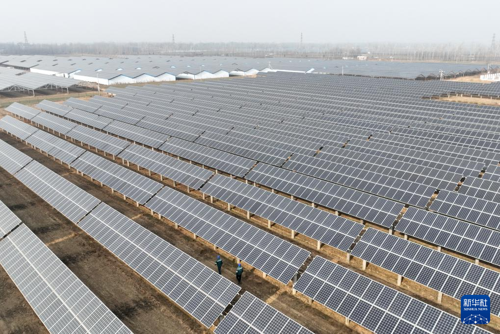 1月16日,国网巨鹿县供电公司的工人在辖区阎疃镇附近的“农光互补”光伏发电场巡检并网线路。新华社记者 杨世尧 摄