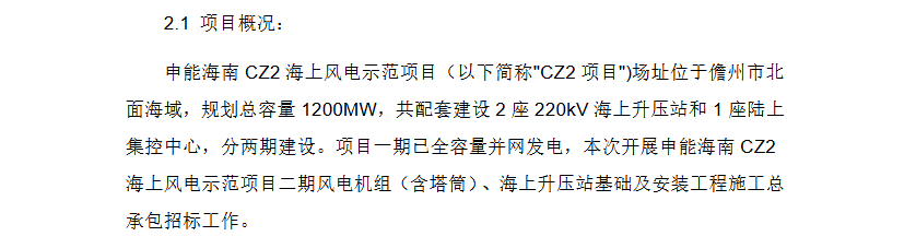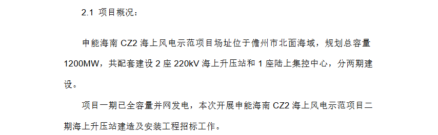 据悉,申能海南CZ2海上风电示范项目场址位于儋州市北面海域,规划总容量1200MW,共配套建设2座220kV海上升压站和1座陆上集控中心,分两期建设。项目一期已全容量并网发电,本次开展的是申能海南CZ2海上风电示范项目二期项目的各项招标工作。