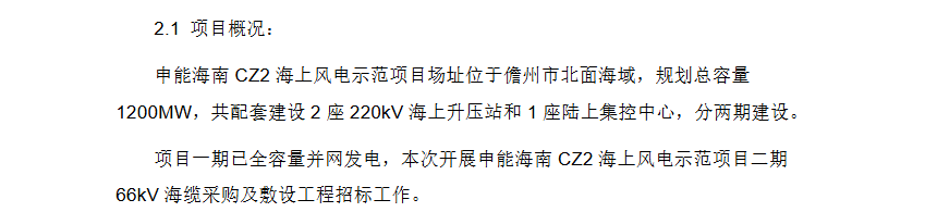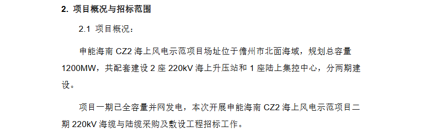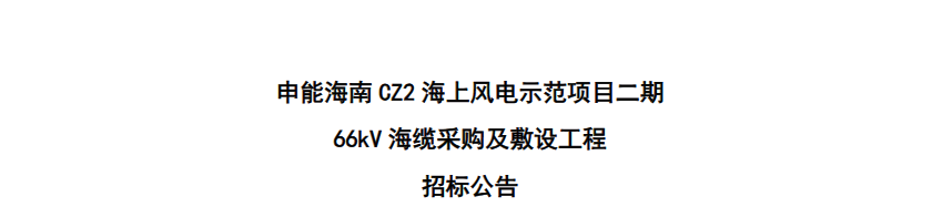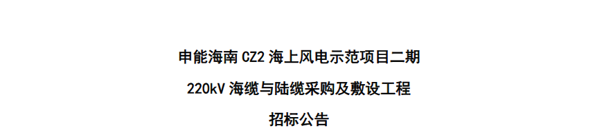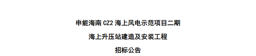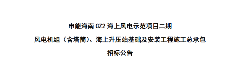 1月23日,申能集团发布《申能海南CZ2海上风电示范项目二期风电机组(含塔筒)、海上升压站基础及安装工程施工总承包招标公告》、《申能海南 CZ2海上风电示范项目二期海上升压站建造及安装工程招标公告》《申能海南 CZ2海上风电示范项目二期66kV海缆采购及敷设工程》、《申能海南 CZ2海上风电示范项目二期220kV海缆与陆缆采购及敷设工程招标公告》等一揽子招标公告。
