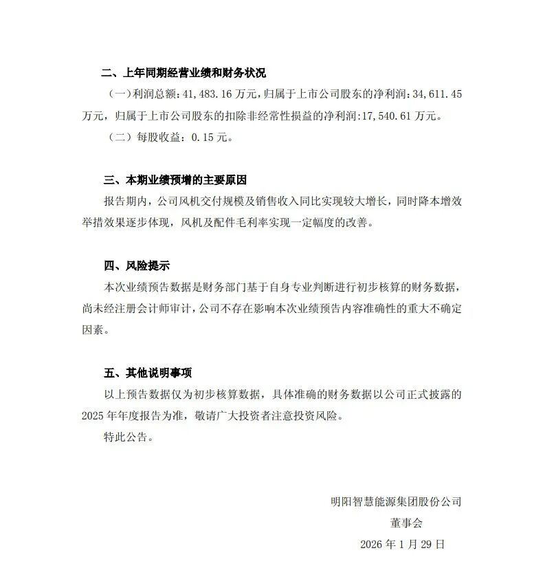 刚刚,明阳智慧能源集团股份公司(简称“明阳智能”)发布2025年年度业绩预增公告,核心财务指标呈现爆发式增长。
