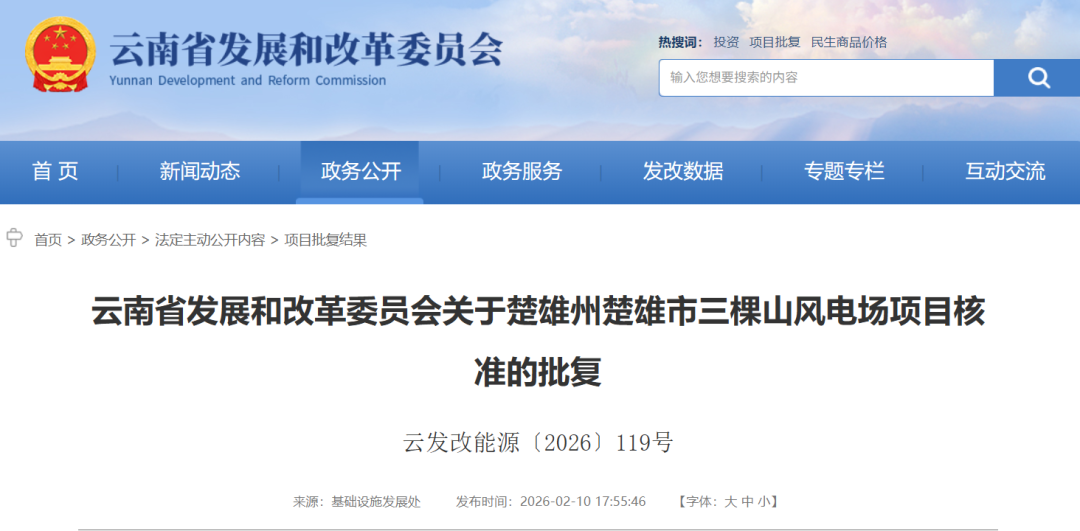 2月10日,云南省发展和改革委员会发布《关于楚雄州楚雄市三棵山风电场项目核准的批复》。