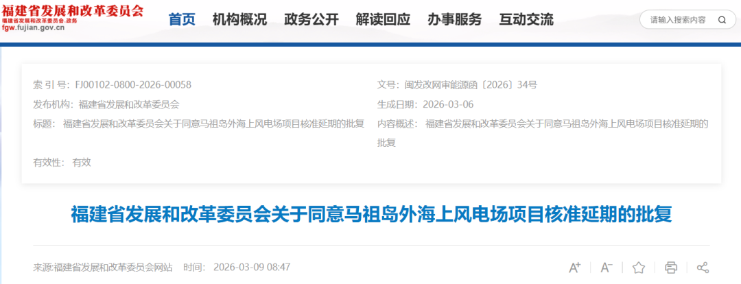 3月9日,福建省发展和改革委员会发布《关于同意马祖岛外海上风电场项目核准延期的批复》。