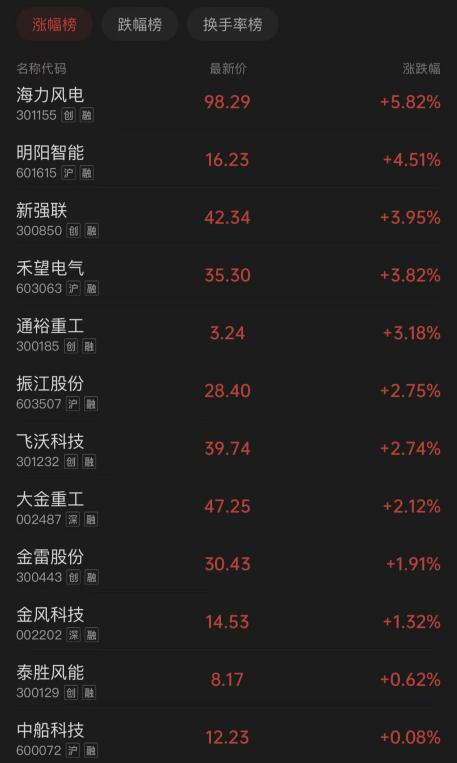 值得一提的是,今日港股风电股也集体走高,中国高速传动涨幅超4%,报1.8港元;龙源电力涨幅超4%,报8.26港元;大唐新能源涨近1%。