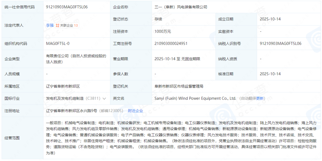 10月14日,三一(阜新)风电装备有限公司成立,注册资本1000万元,经营范围包含电工仪器仪表制造;发电机及发电机组制造;陆上风力发电机组销售;海上风力发电机组销售等。企查查股权穿透显示,该公司由三一重能全资持股。