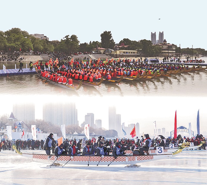 哈尔滨市职工端午龙舟赛和冰上龙舟赛在松花江上举行。