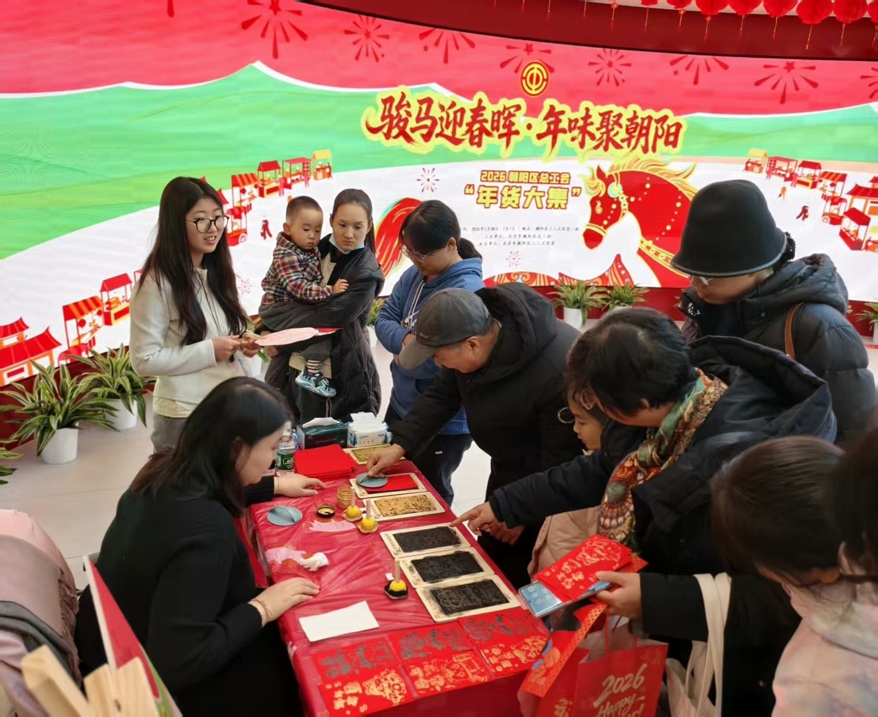 “泼墨迎春”主题区域吸引了众多传统文化爱好者。书法家现场挥毫,书写赠送春联与“福”字,传递笔墨祝福。“漆扇绘春”与“红包拓印”非遗手作坊,市民在非遗老师的耐心指导下亲手制作作品,不仅收获了独一无二的新春纪念,更在动手实践中增进了对传统技艺的理解与喜爱。