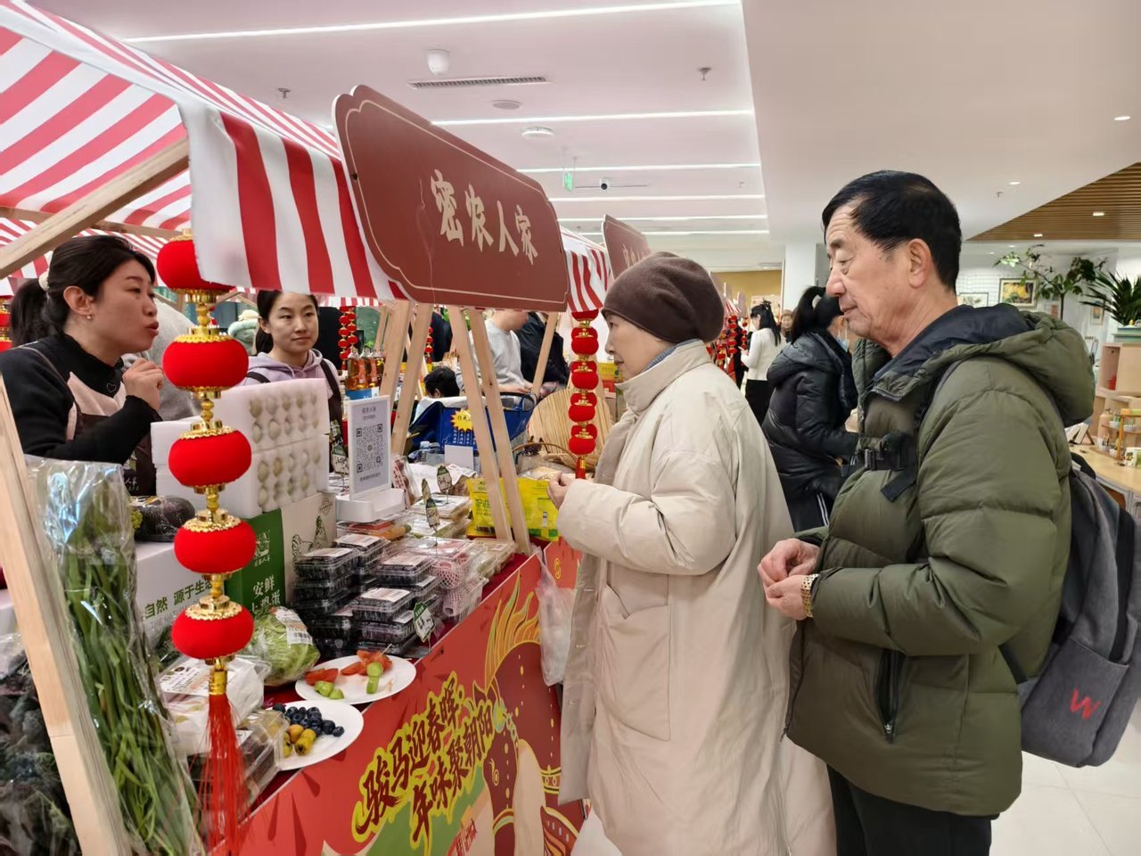 走进文化宫一层大厅,“福满农香·助农年货街”早已是人头攒动。20余个统一装饰着“福字灯笼”的主题花车摊位整齐排开,琳琅满目的商品令人目不暇接。来自各地的优质米面粮油、特色农产品成为市民采购的重点。除了传统的年货,现场还有各式各样的节庆装饰、文创礼品、儿童玩具,更有包装精致的特色糕点等传统小吃摊位飘香,满足市民“一站式”购齐年货的需求。