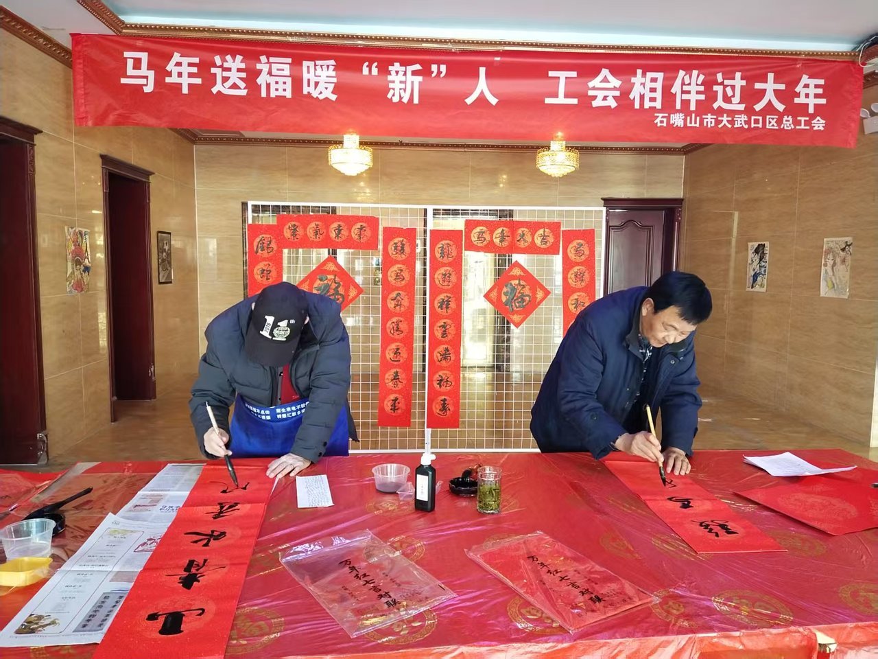 活动还特别设置了“送万福 进万家”书法公益环节,邀请当地知名书法家现场挥毫泼墨。长桌铺开,墨香氤氲,楷书“福”字圆润饱满,行书对联遒劲飘逸。“春到九州新、福临万家暖”“一程风雨一程歌、万里奔波万里春”……一副副定制春联被劳动者仔细卷好,小心地放入送餐箱中。快递员小王举着墨迹未干的“敬业福”,开心地说:“这可比打印的对联金贵多了,我要贴在站点,图个平安吉利。”