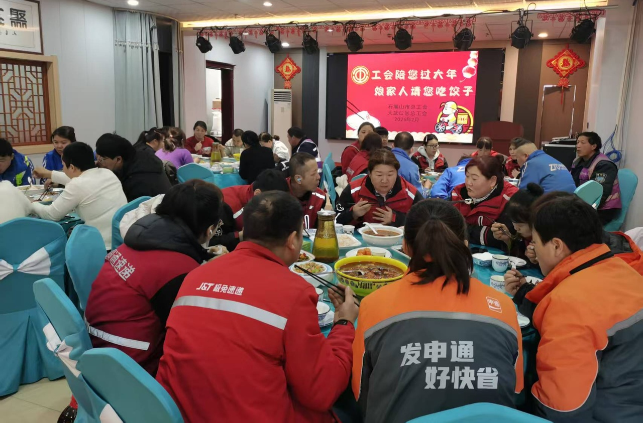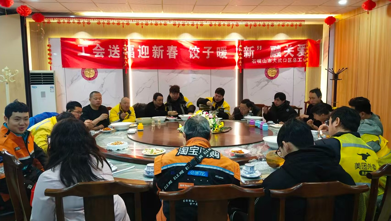 2月12日,农历小年刚过,年味渐浓。在宁夏回族自治区石嘴山市大武口区聚鑫餐饮工会微驿站内,一派温馨热闹的景象正在上演:热气腾腾的饺子散发出诱人的香味,红彤彤的“福”字映照着一张张笑脸。由大武口区总工会精心策划的“工会陪您过大年,娘家人请您吃饺子”暖心慰问活动在这暖意融融的氛围中温情启幕。百余名外卖骑手、快递小哥结束午间高峰配送工作后围坐在一起,像家人般共享了一顿提前到来的、暖心的“团圆饭”。