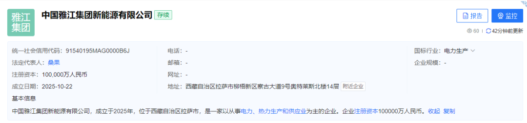 据天眼查App显示,10月22日,中国雅江集团新能源有限公司成立,法定代表人为桑果,注册资本10亿人民币,经营范围含太阳能发电技术服务、风力发电技术服务、储能技术服务、发电技术服务、新兴能源技术研发、新能源原动设备制造、新能源原动设备销售、站用加氢及储氢设施销售、信息系统集成服务、数据处理和存储支持服务等。