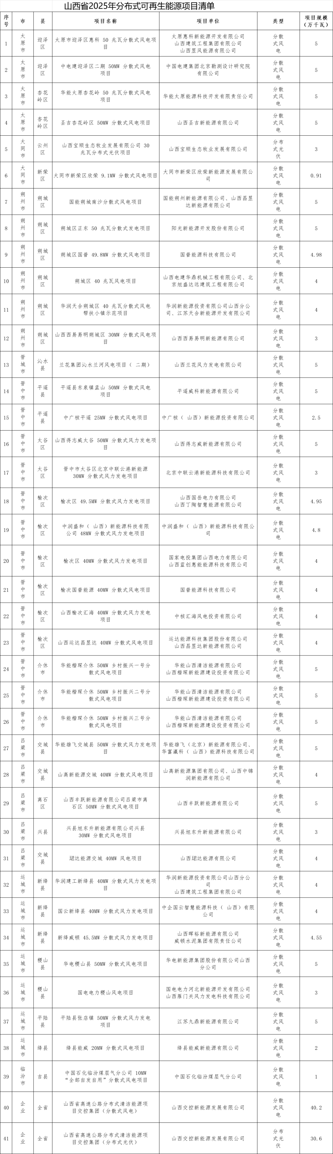 根据《山西省人民政府办公厅关于印发山西省推进分布式可再生能源发展三年行动计划(2023—2025年)的通知》(晋政办发〔2023〕5号)和《关于做好2025年分布式可再生能源发展有关工作的通知》(晋能源新能源发〔2025〕193号),经申报、评审和公示,现下达山西省2025年分布式可再生能源项目建设计划,项目共41个、总规模231.49万千瓦,有关事项通知如下: