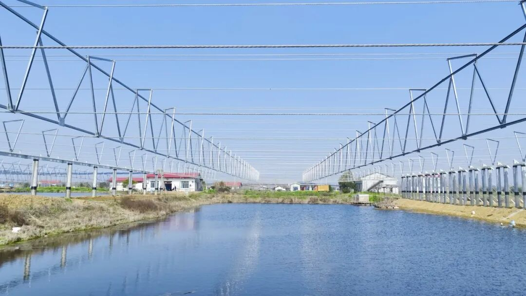 该柔性支架产品净空高度范围为3至8米,最大跨度可达50米以上。这种高净空和大跨度的设计,使得光伏组件能够灵活布置在各种复杂地形上,如鱼塘、山坡等,同时不影响土地的原有使用功能,实现生态与经济效益双赢,推动形成绿色生产生活方式。