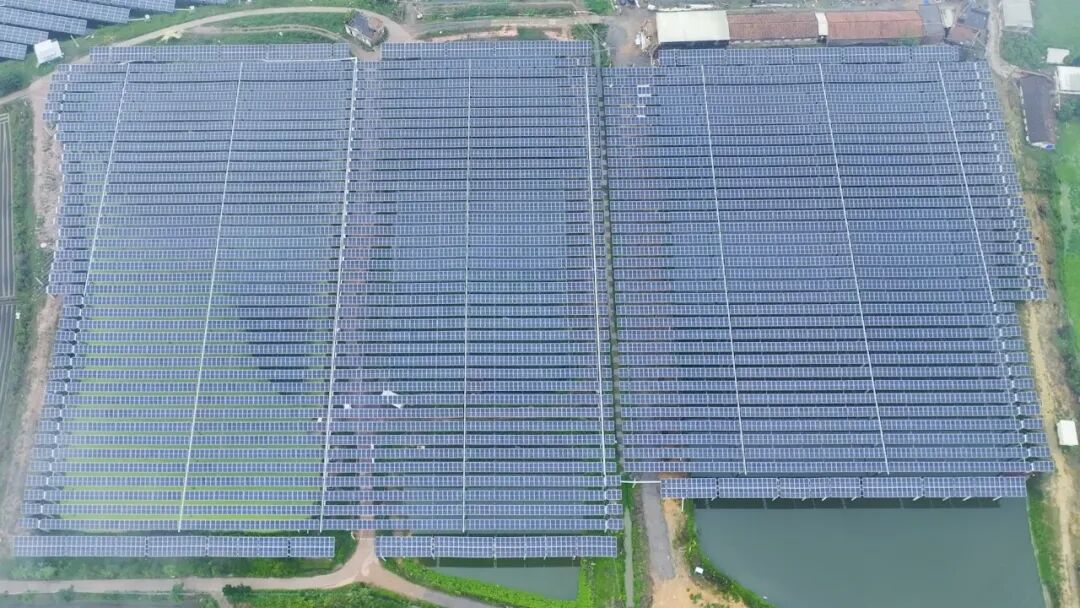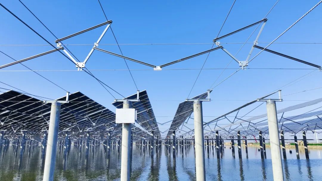 在华容县牛氏湖渔光互补项目中,深圳安泰科的柔性支架边桩高6米,最大跨度突破50米,将立柱布置在鱼塘间的道路边坡上,实现了水域空间的全方位立体利用,土地利用率提高了20%-30%。