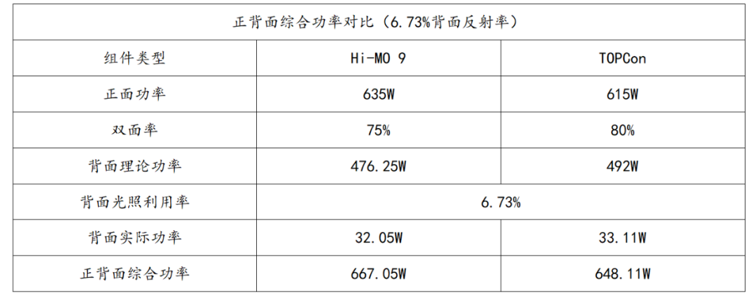 在综合功率计算方面,基于山东烟台实证基地6.73%背面反射率的实际环境条件,Hi-MO 9组件的正背面综合功率达到667.05W,显著高于TOPCon组件的648.11W,在实际应用场景中展现出更强的功率输出能力。
