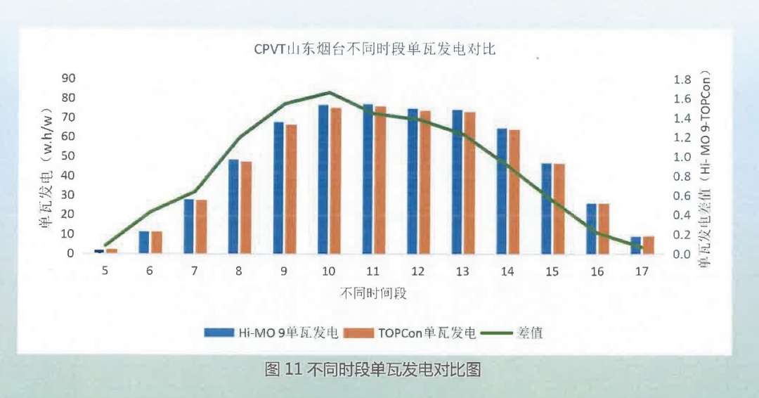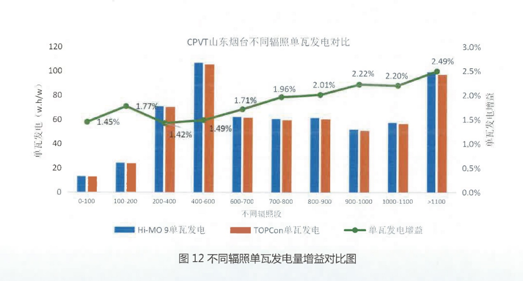 尤为值得关注的是,Hi-MO 9组件的性能优势呈现出全时段、全辐照度的普遍性特征。从清晨5:00至傍晚17:00的各个监测时段,以及在0-1100W/㎡的各辐照区间内,Hi-MO 9组件均保持对TOPCon组件的稳定正增益。