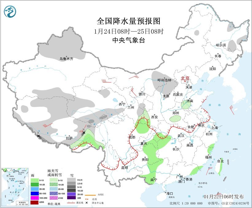 全国降水量预报图(1月24日08时-25日08时)