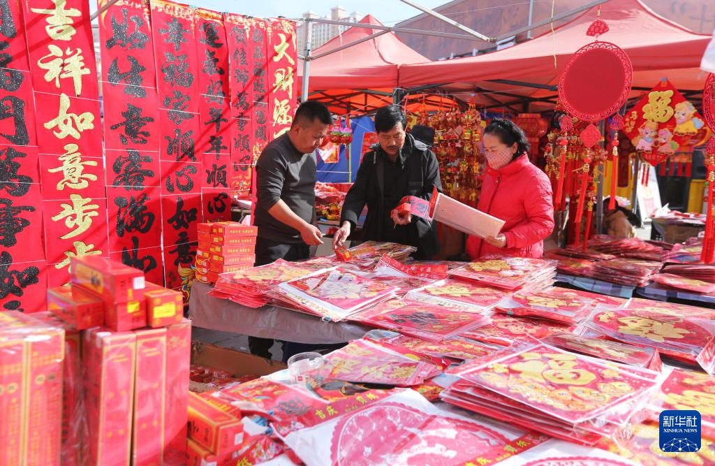 2月14日,人们在甘肃省定西市安定区年货市场选购春节饰品。