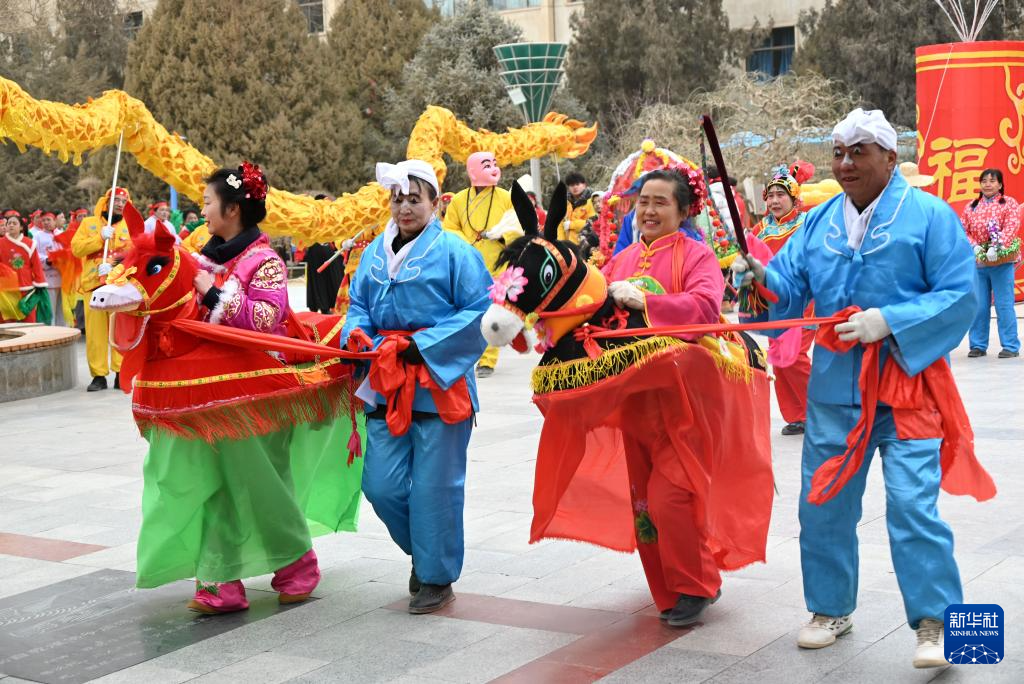 2月15日,一支社火队在甘肃省敦煌市城区市政广场表演社火跑驴。