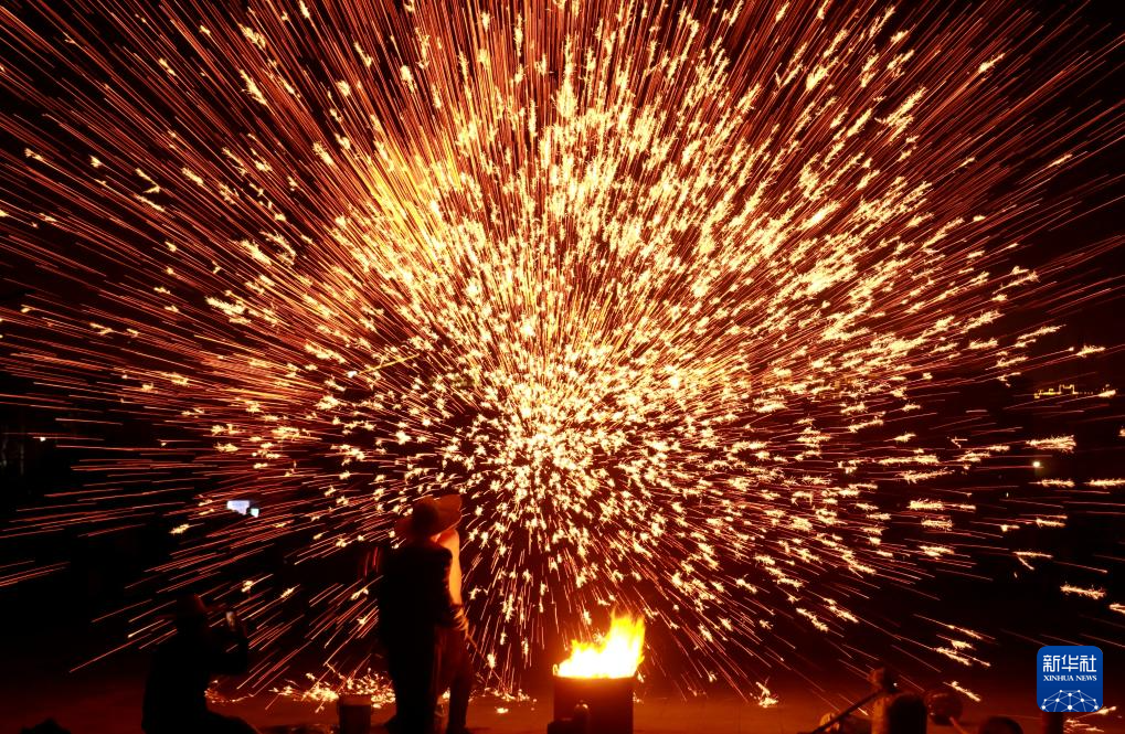 2月14日,在河南省安阳市内黄县文化体育中心,民间艺人表演打铁花。