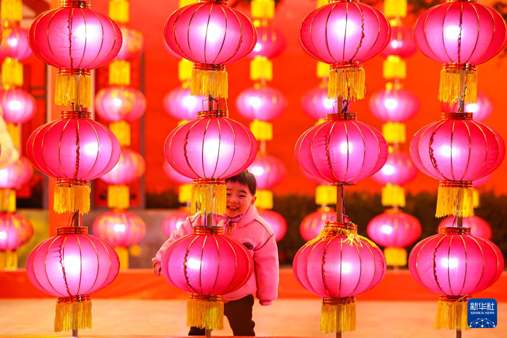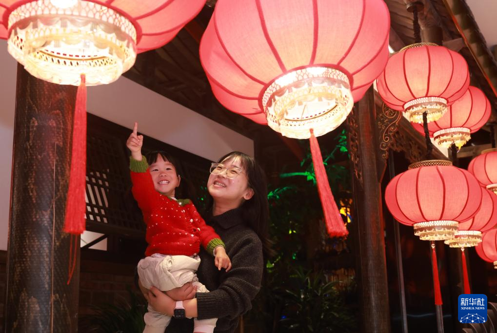 2月14日,人们在湖北省武汉市武昌区一家购物中心红灯笼下玩耍。