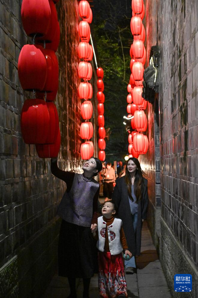 2月14日,人们在浙江衢州古城文化旅游区水亭门历史文化街区赏灯游玩。