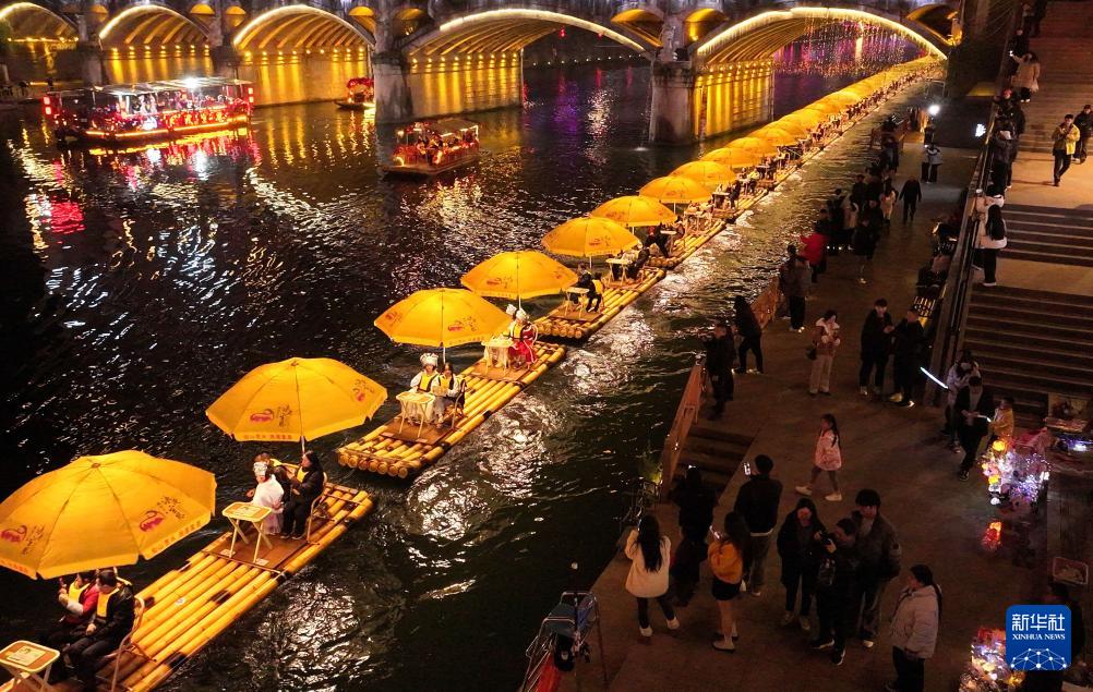 2月14日,游客在湖北省宣恩县城贡水河上乘坐“龙游贡水”竹筏赏夜景(无人机照片)。